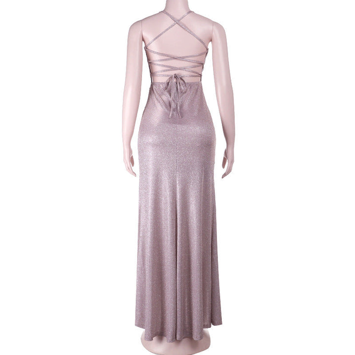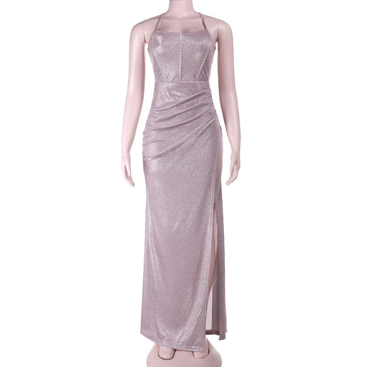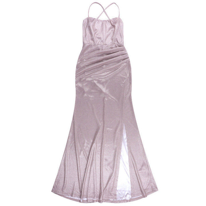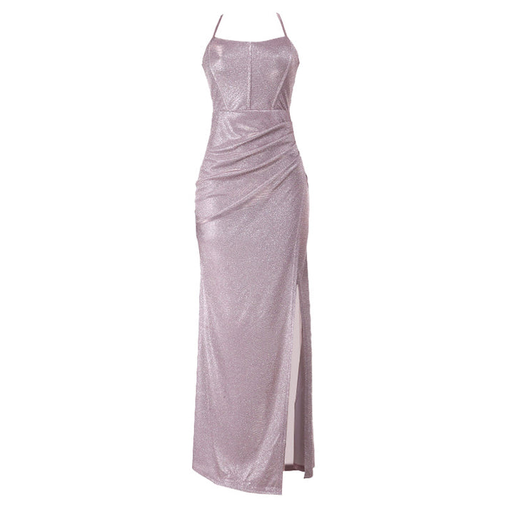 Cross back self tie ruched zip-up slit cami maxi dress