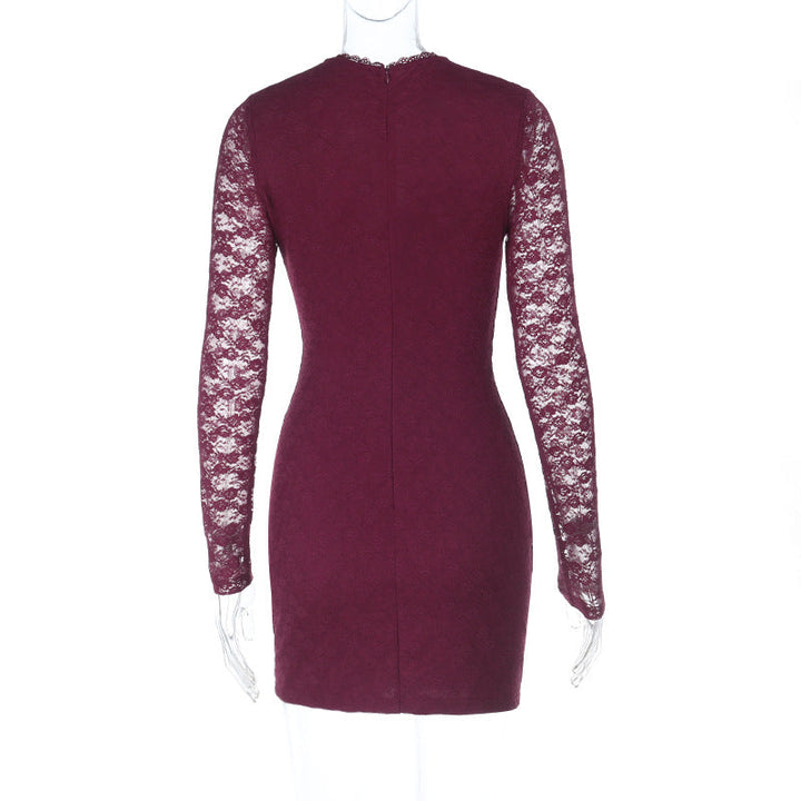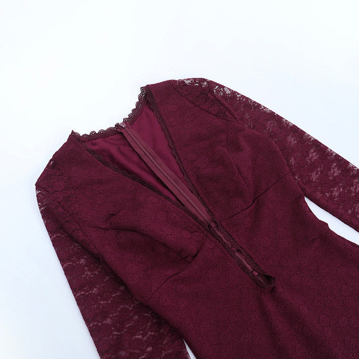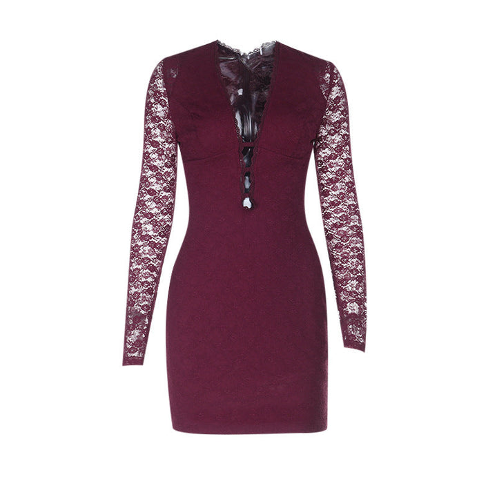 Lace long sleeve v neck zip-up solid mini dress