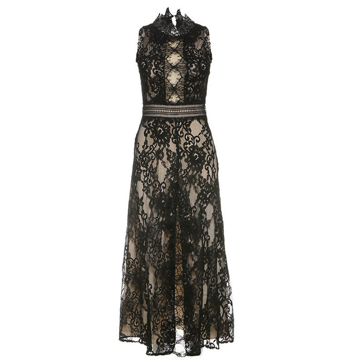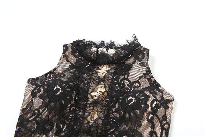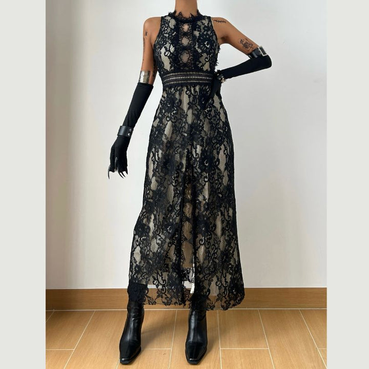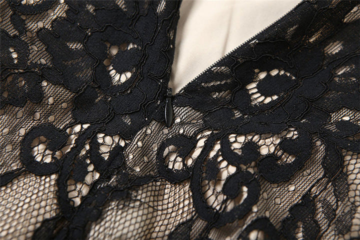 Lace slit zip-up irregular crewneck midi dress