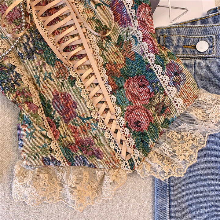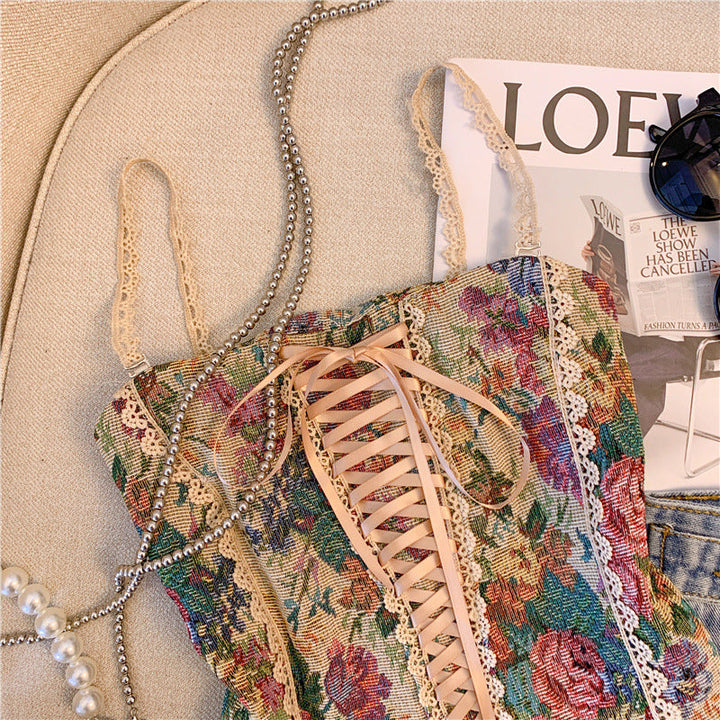 Lace up smocked lace hem flower pattern cami top