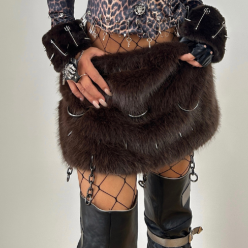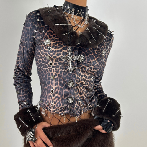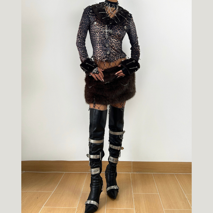 Leopard print long sleeve fluffy skull applique mini skirt set