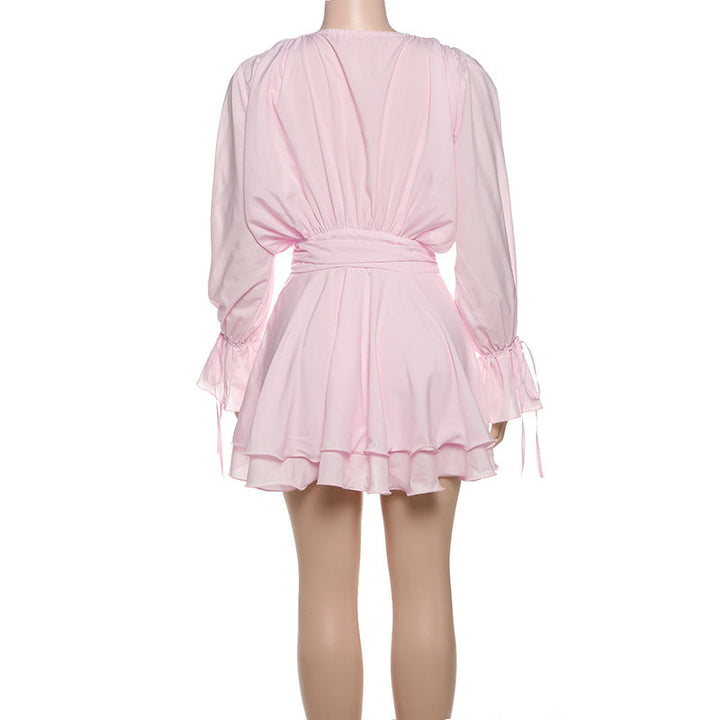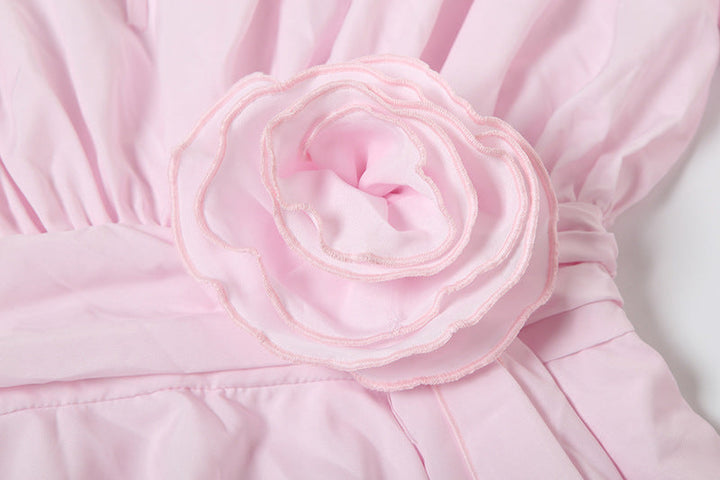 Long flared sleeve flower applique ruched ruffle mini dress