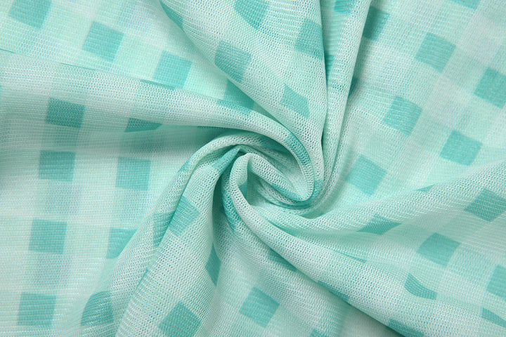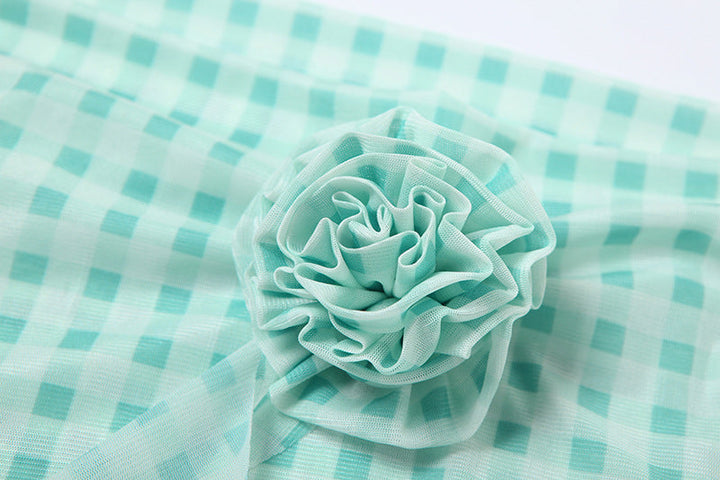 Plaid flower applique off shoulder mesh top