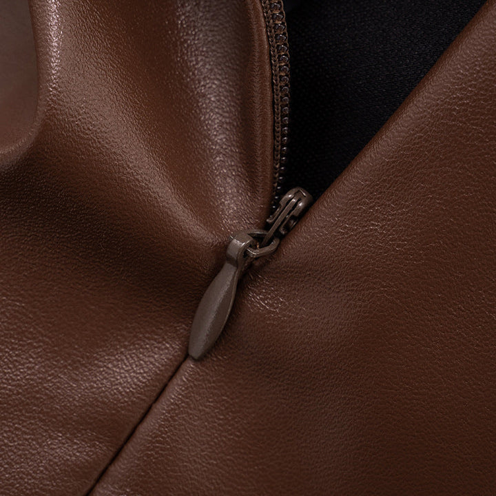 PU leather zip-up ruched irregular mini skirt set