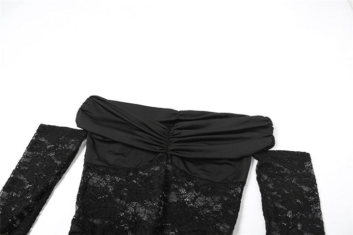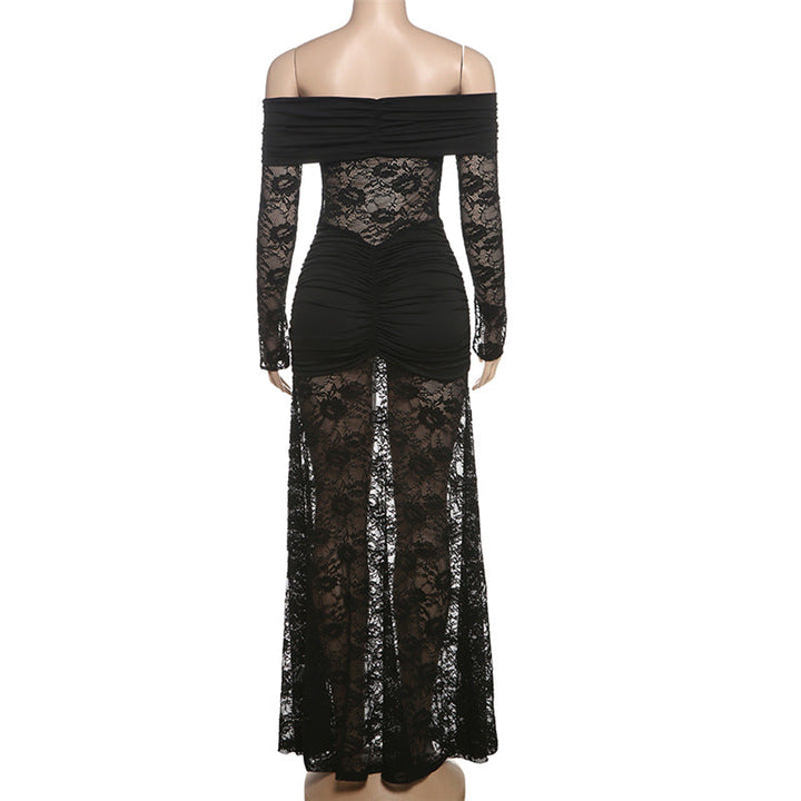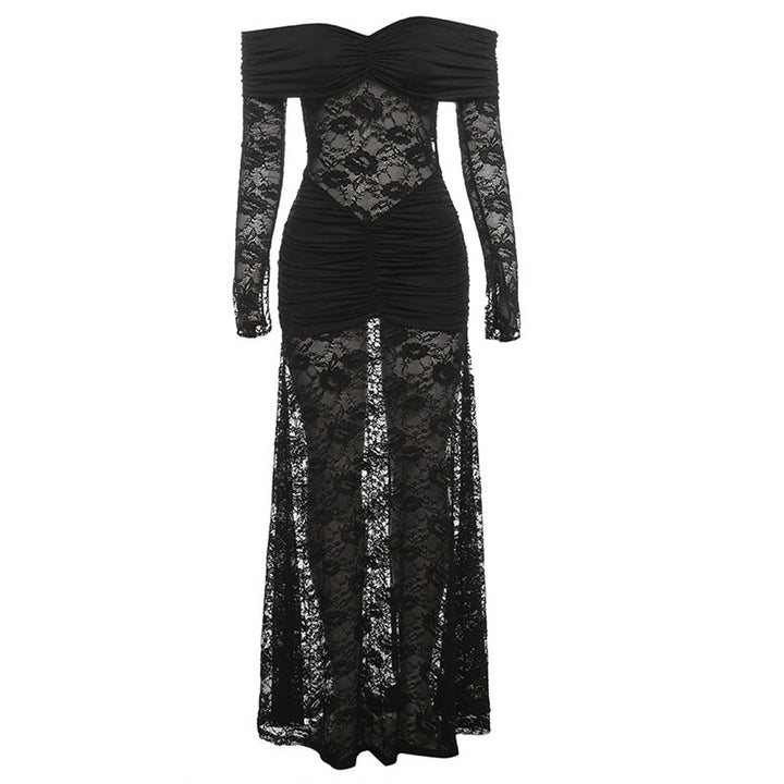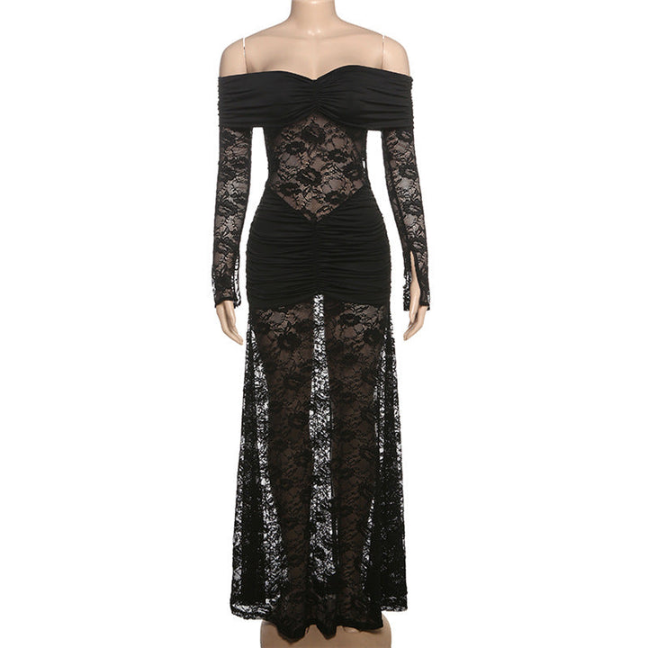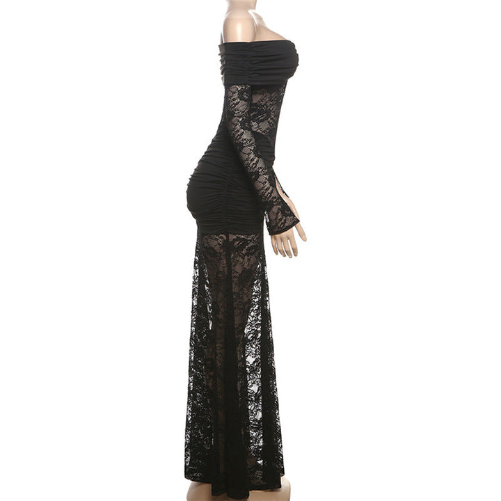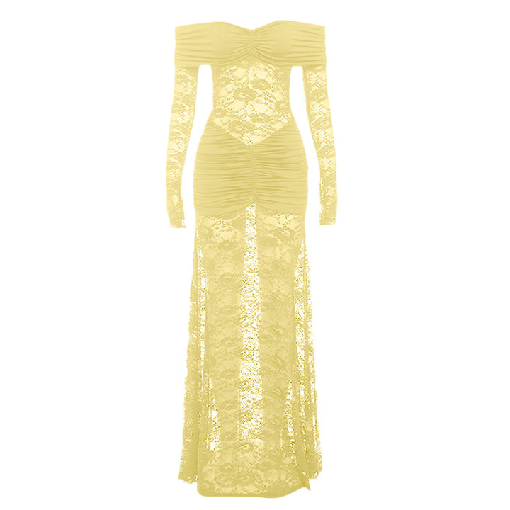 Ruched long sleeve lace off shoulder maxi dress