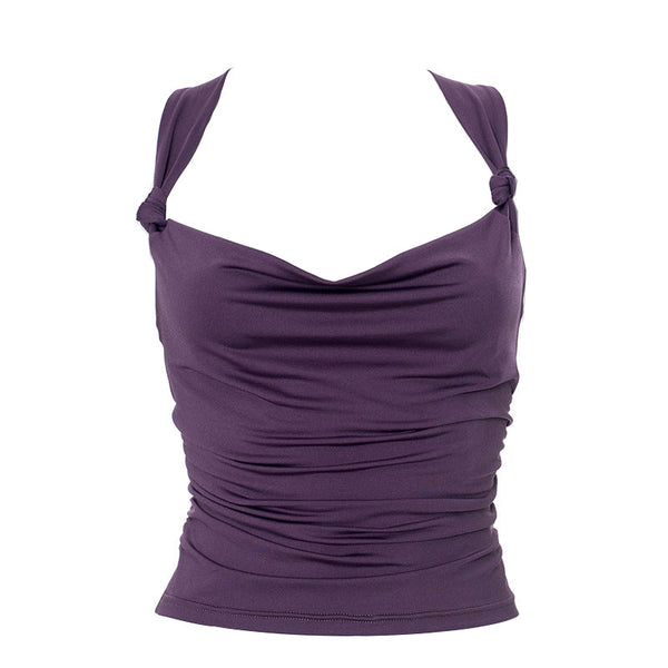 Top metálico con cuello vuelto y hebilla, fruncido y sin espalda