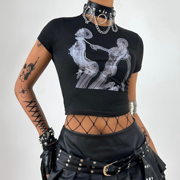 Top corto liso con cuello redondo y cadena de metal con hombros descubiertos y manga larga gótico Moda Darkwave alternativa gótica Moda Darkwave emo