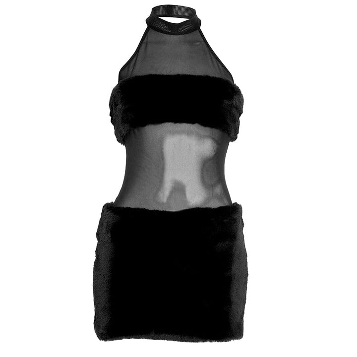 Halter fluffy mesh patchwork mini dress