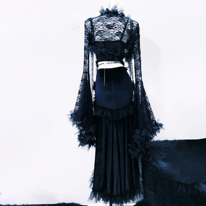 Hollow out long sleeve flower applique lace maxi dress