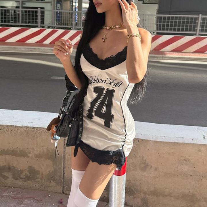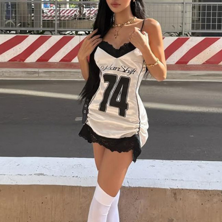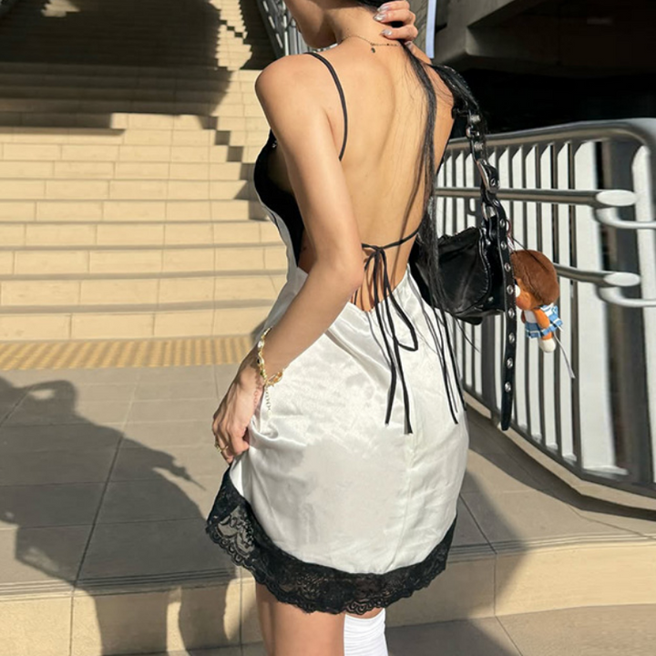 Lace hem v neck print backless cami mini dress