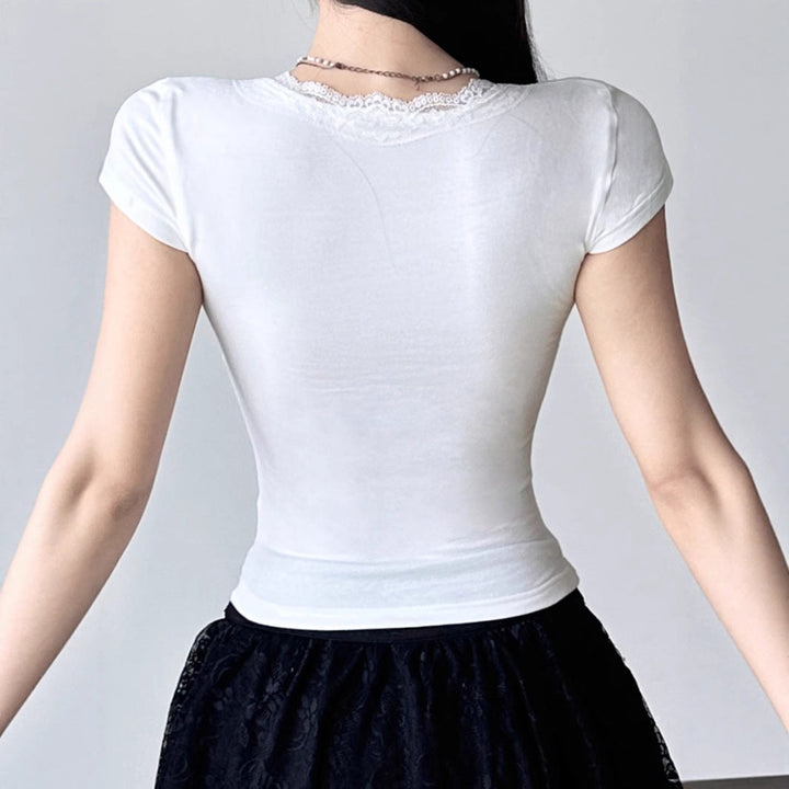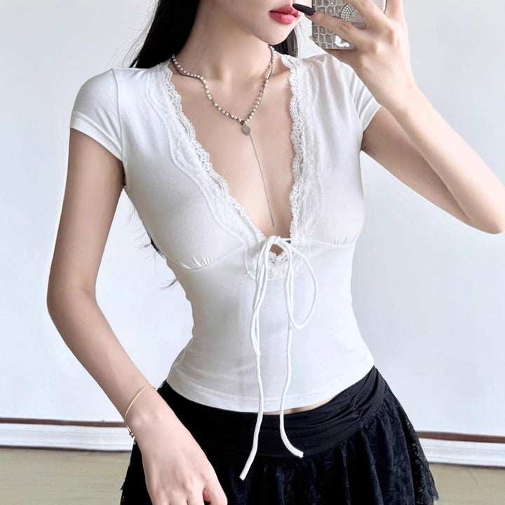 Lace hem v neck self tie cap sleeve top