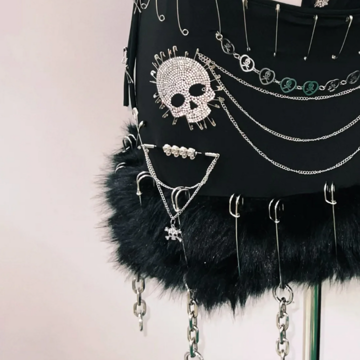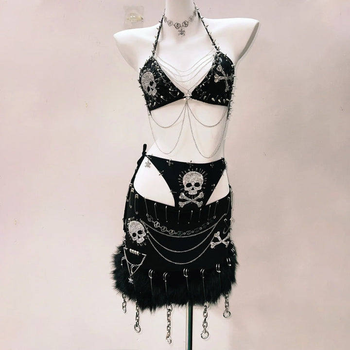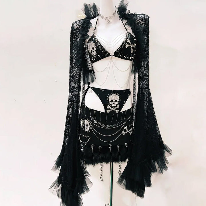 Metal chain long sleeve lace skull pattern mini skirt set