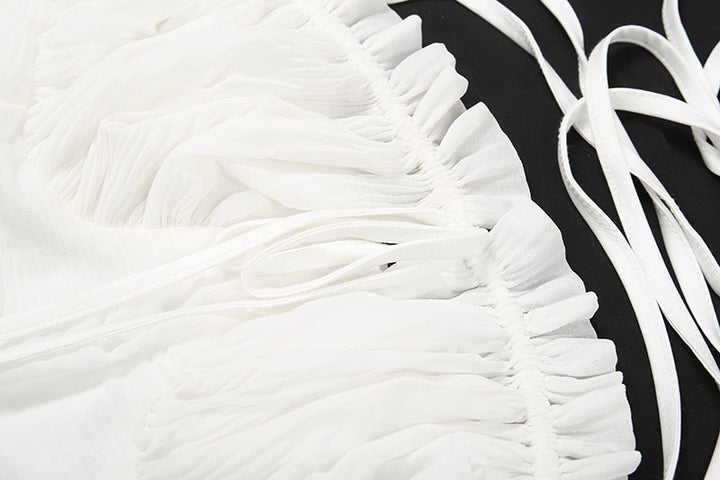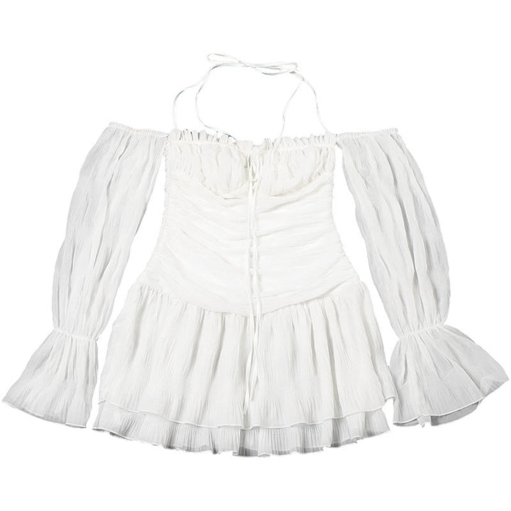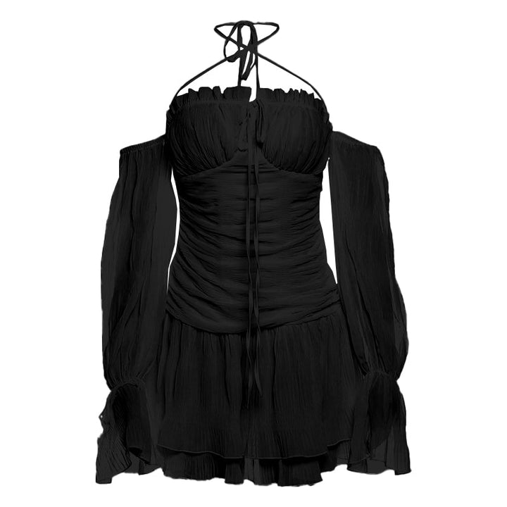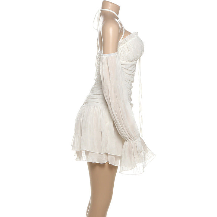 Off shoulder ruched long sleeve self tie ruffle mini dress