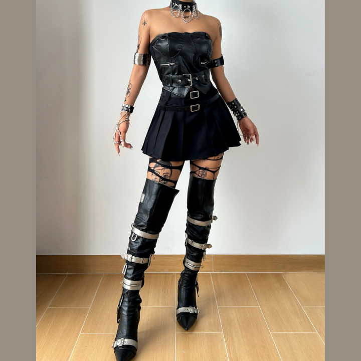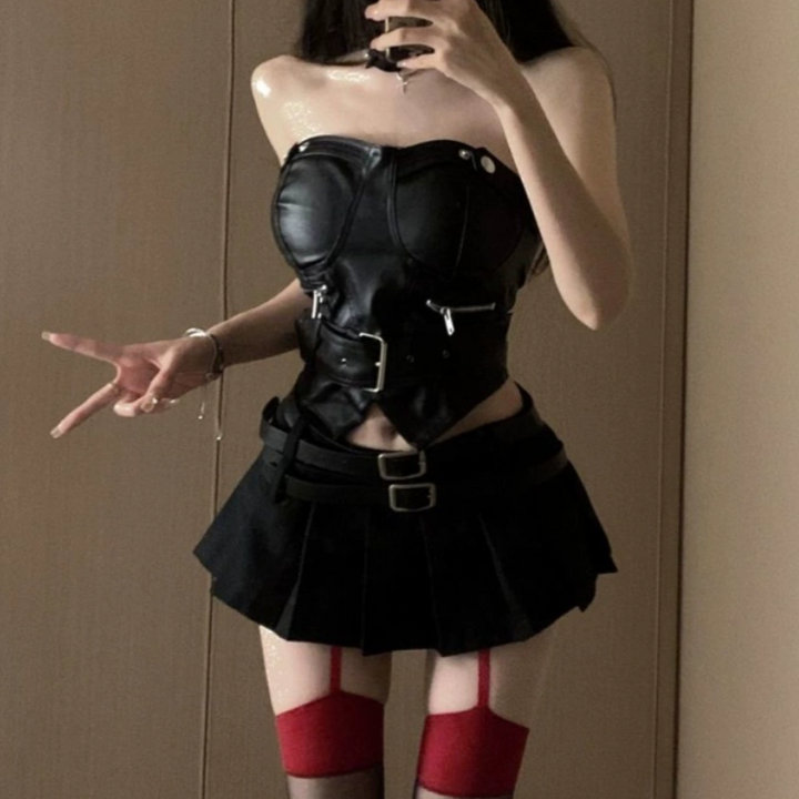 Zip-up PU leather pleated A line tube mini skirt set