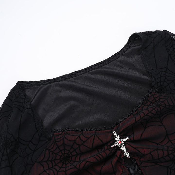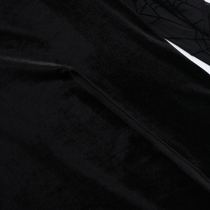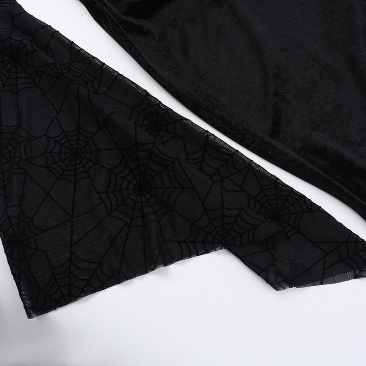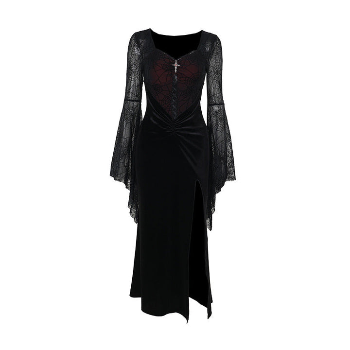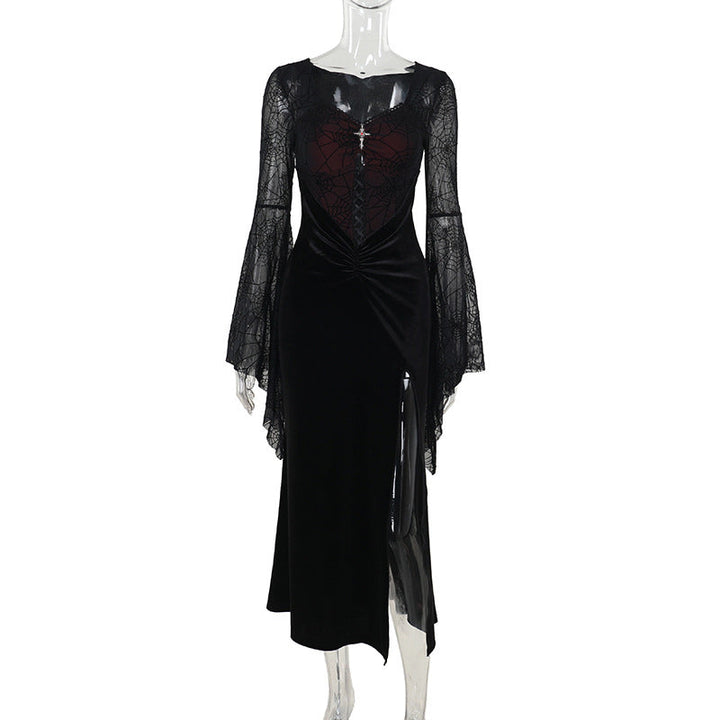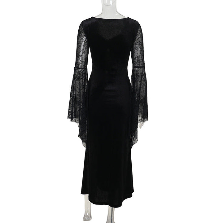 Long flared sleeve spider web slit velvet ruched maxi dress
