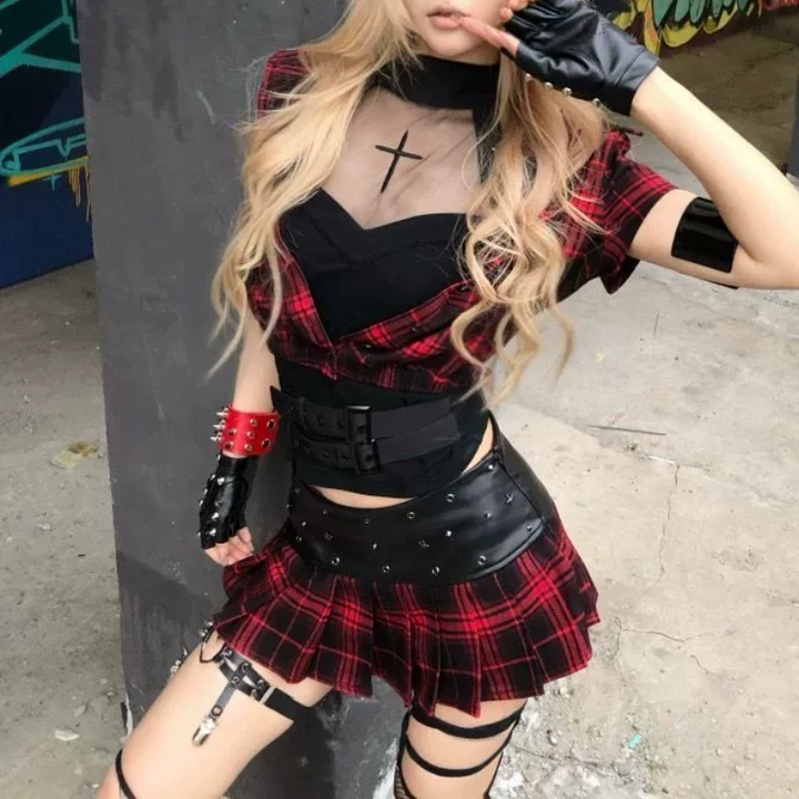 Plaid button pleated short sleeve 3 piece mini skirt set