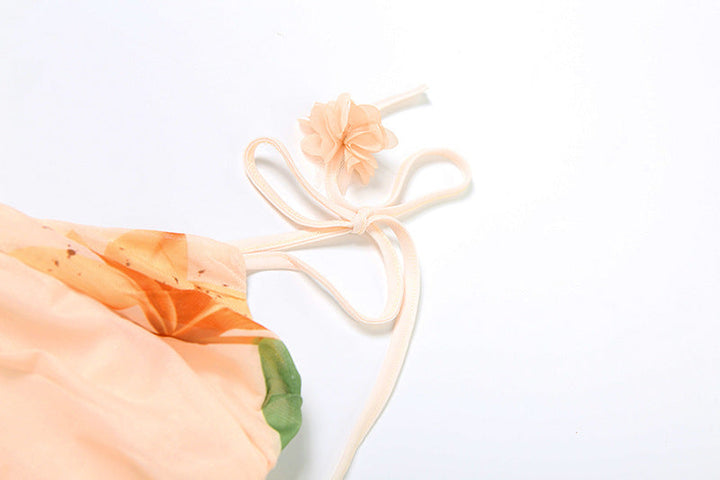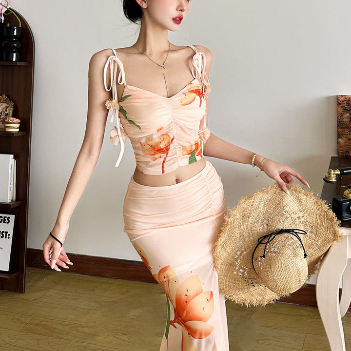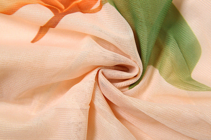 Ruched flower print v neck mesh cami top