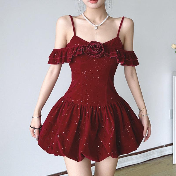 Ruched ruffle smocked corset sweetheart neck mini dress