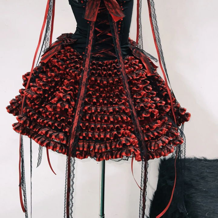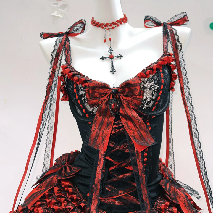 Bowknot ruffle self tie hollow out mini skirt set