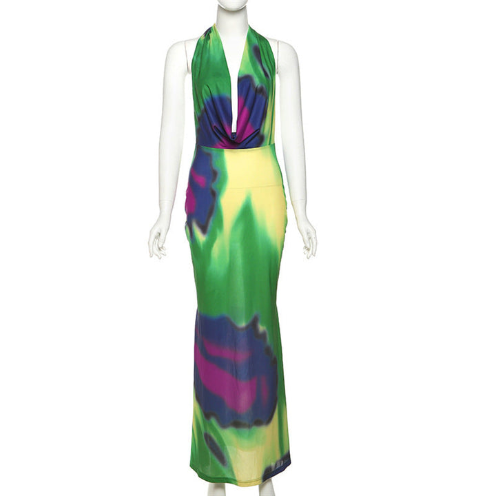 Cowl neck halter self tie print maxi dress