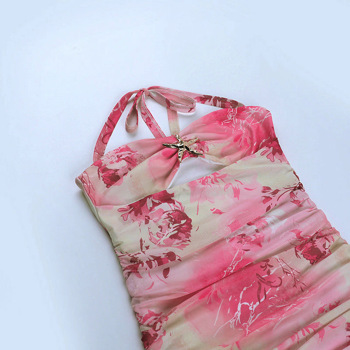 Halter self tie ruched hollow out print mini dress
