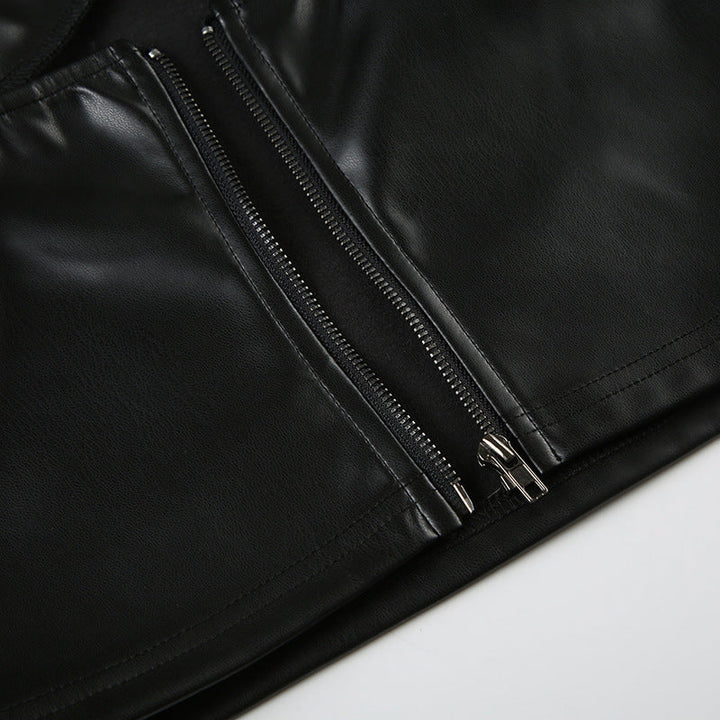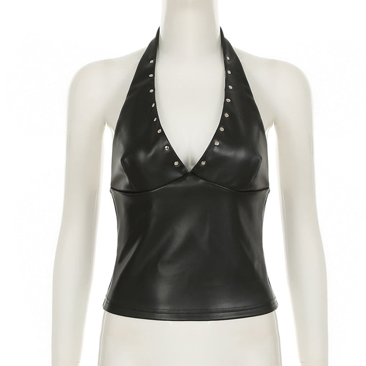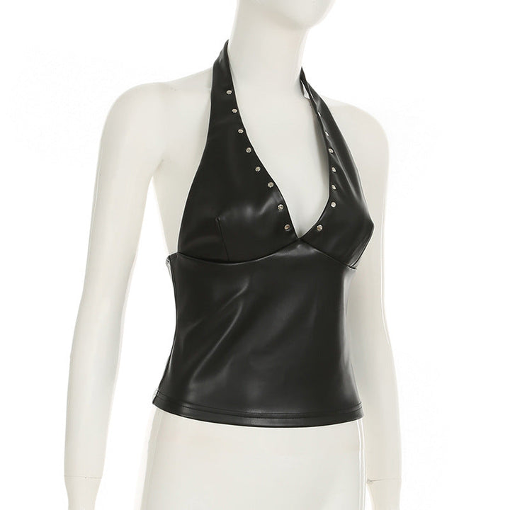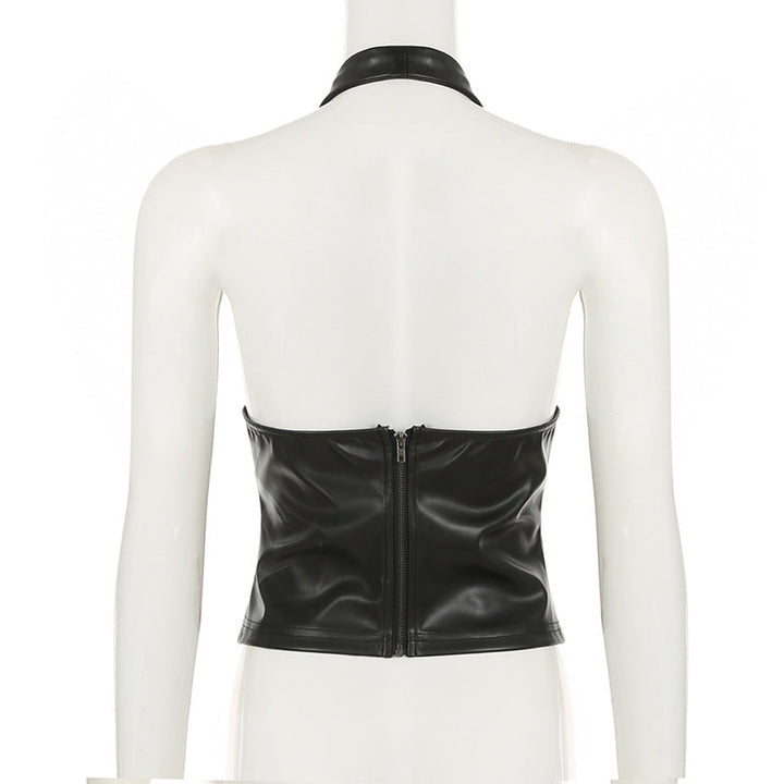 Halter zip-up PU leather v neck top