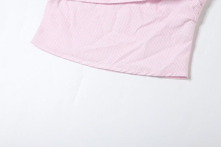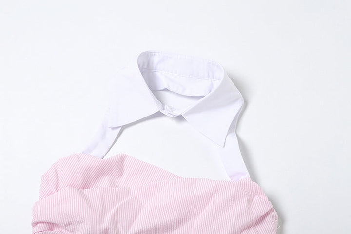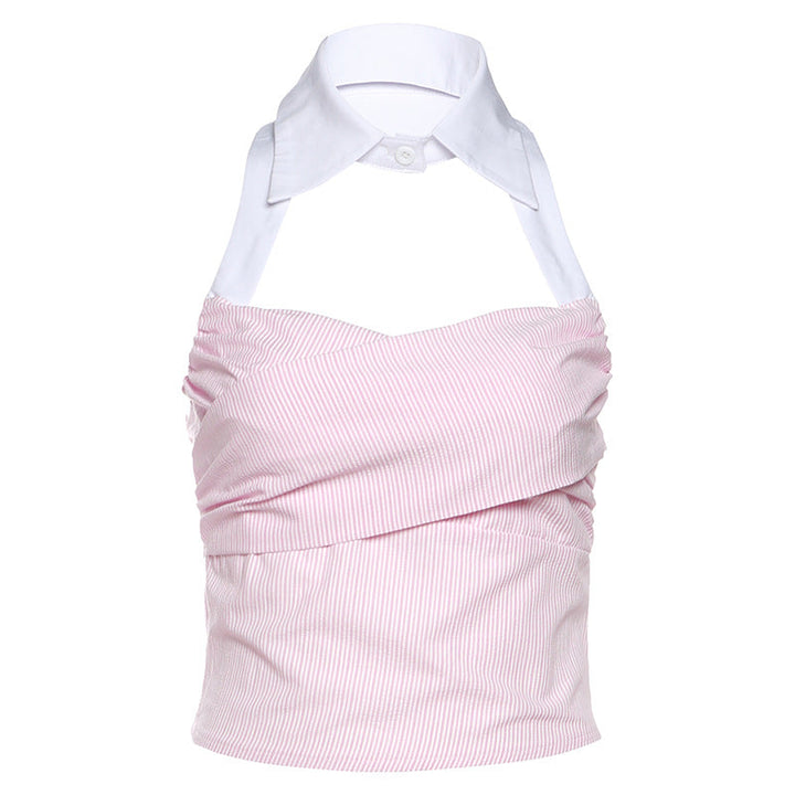 Hollow out button halter striped smocked top
