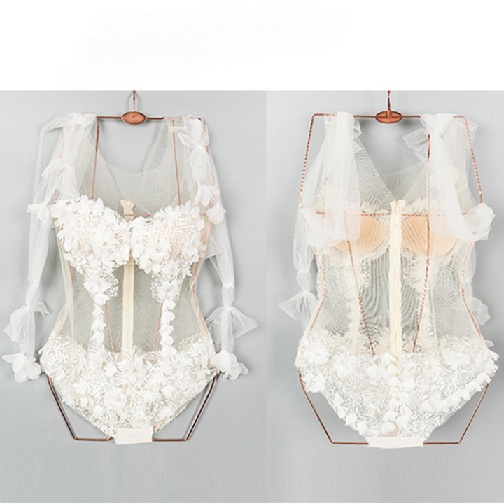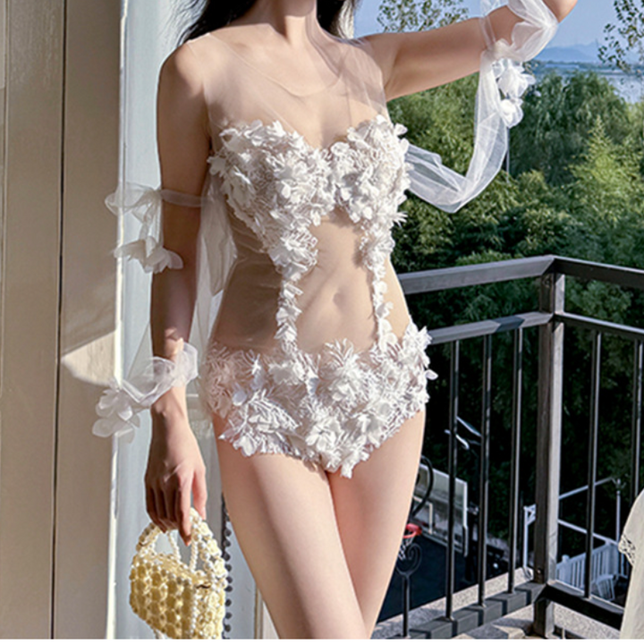 Lace mesh flower applique zip-up bodysuit