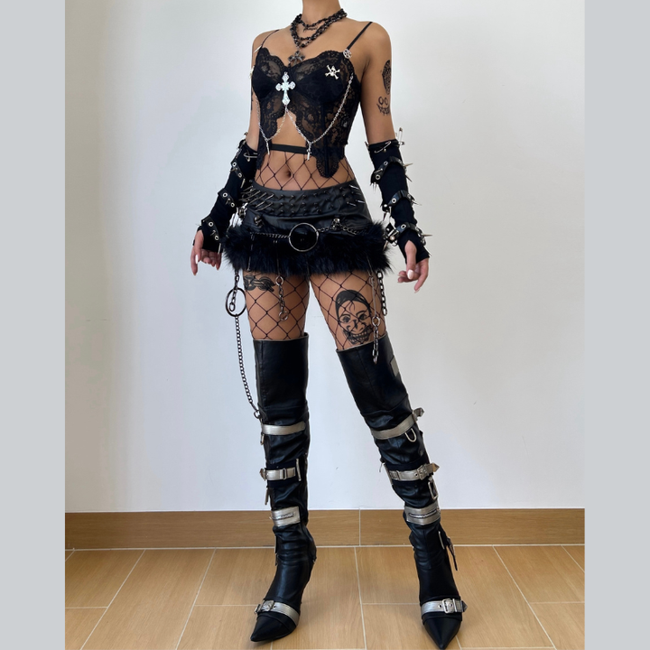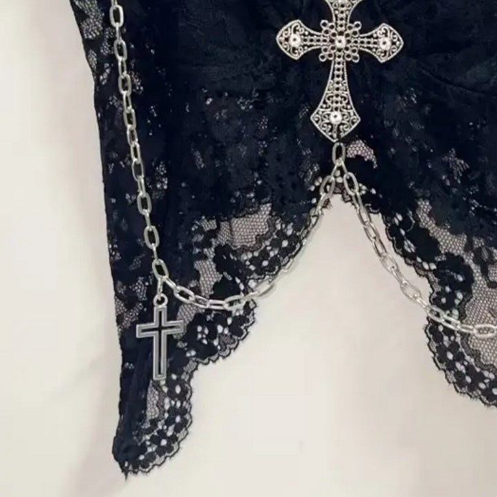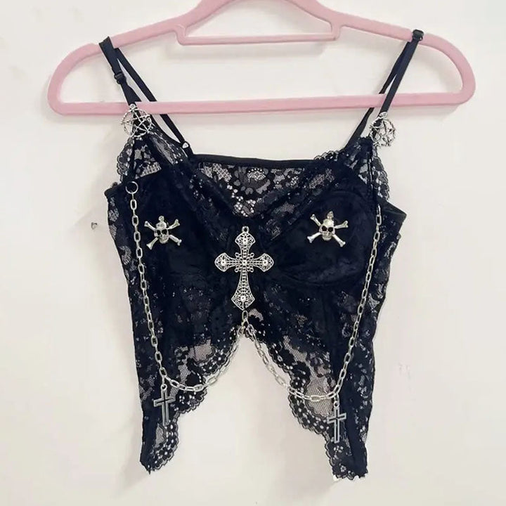 Lace metal chain cross applique v neck cami top