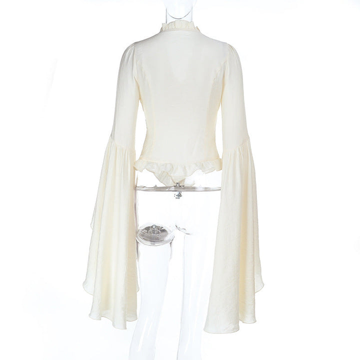 Long flared sleeve v neck ruched solid top