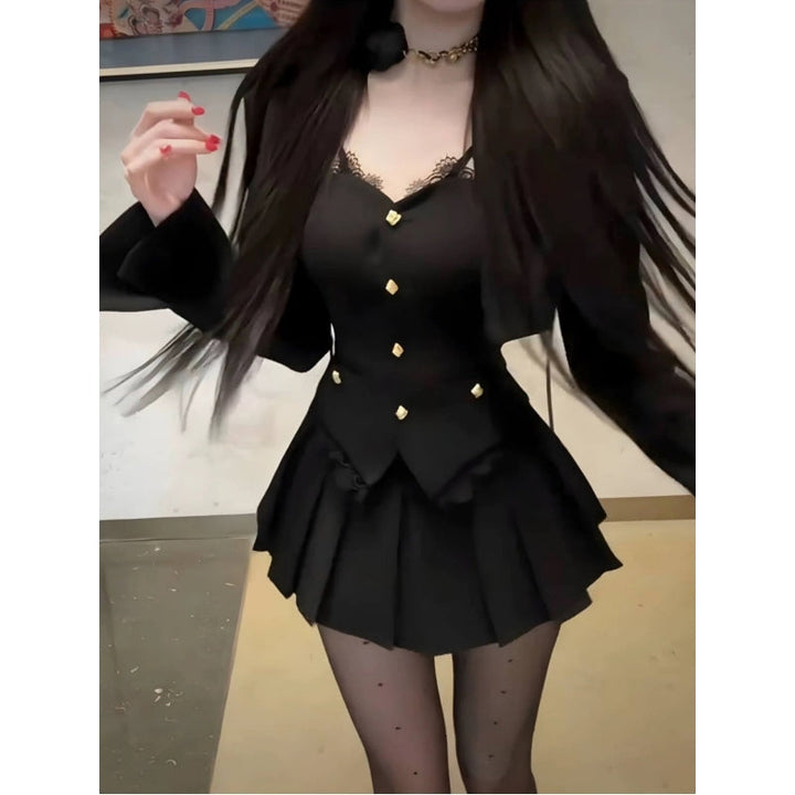 Long sleeve lace hem pleated corset 3 piece mini skirt set