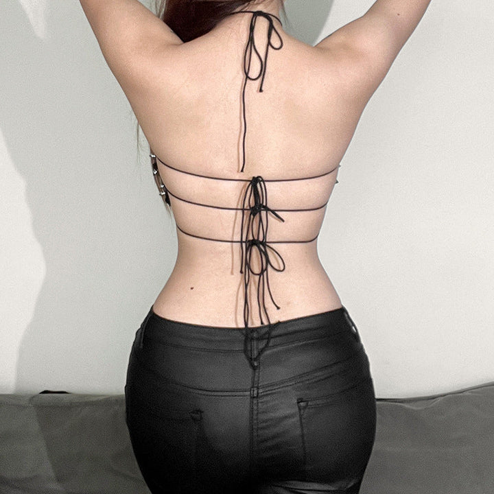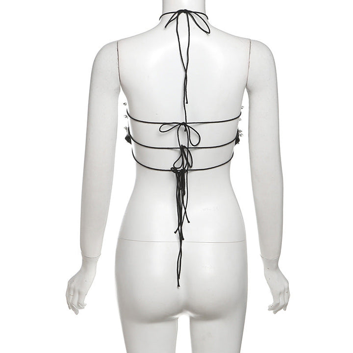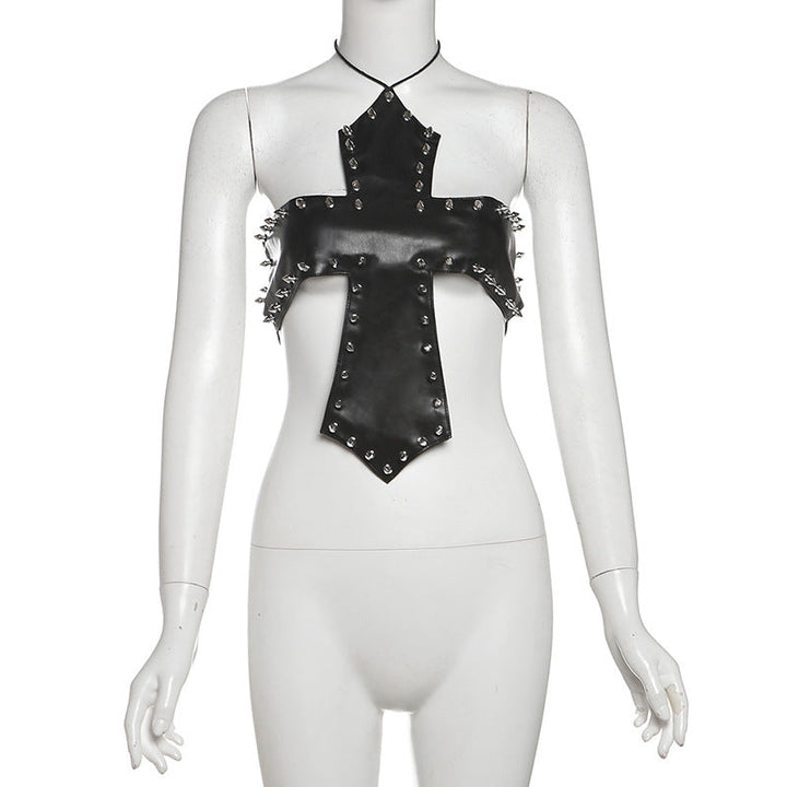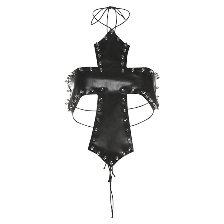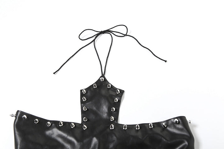 PU leather rivet self tie halter top