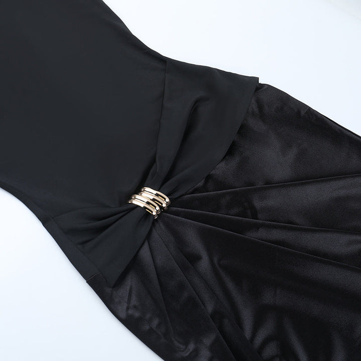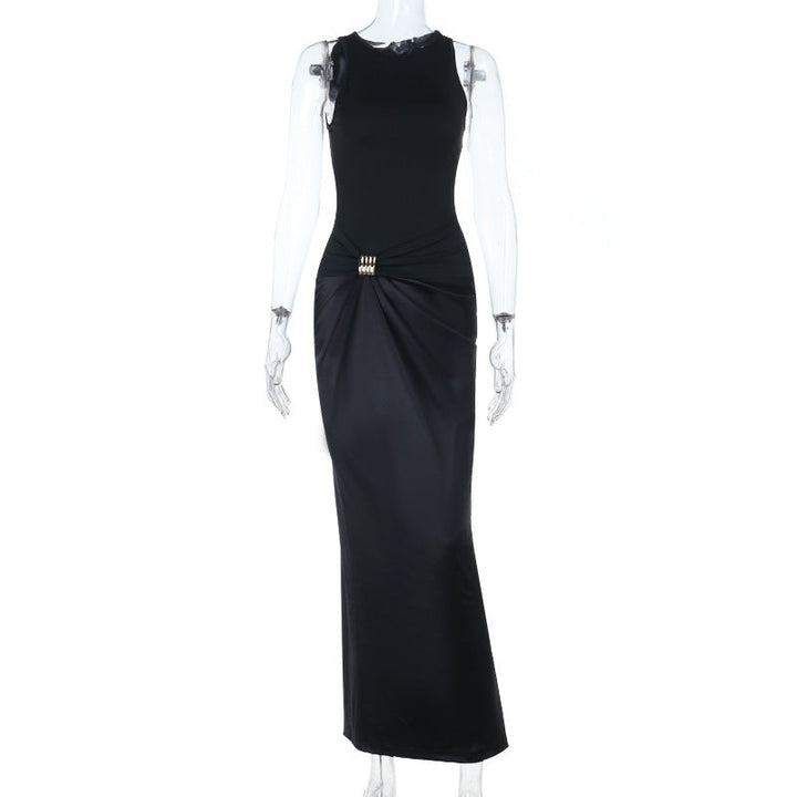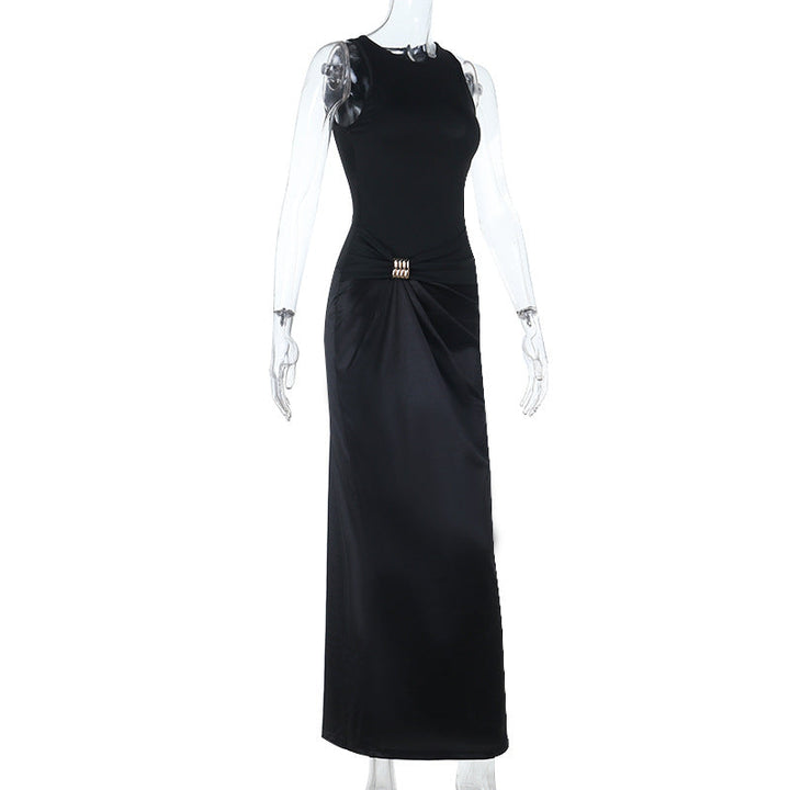 Round neck satin ruched solid maxi dress