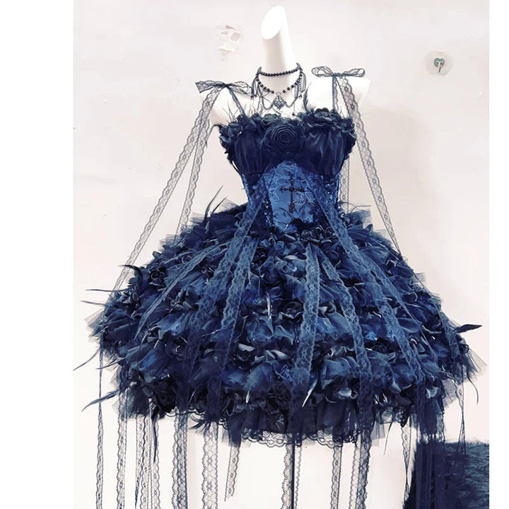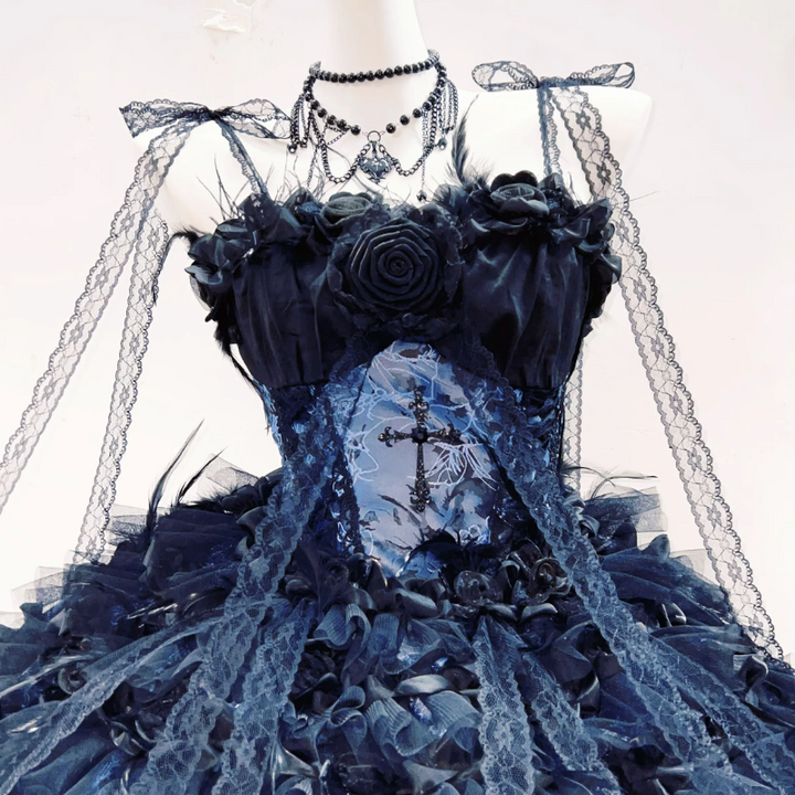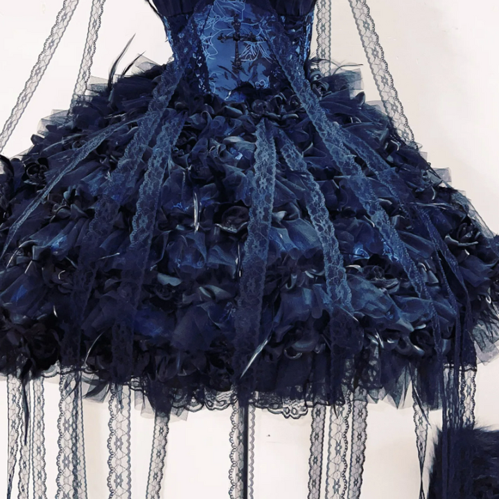 Flower applique feather velvet self tie mini dress