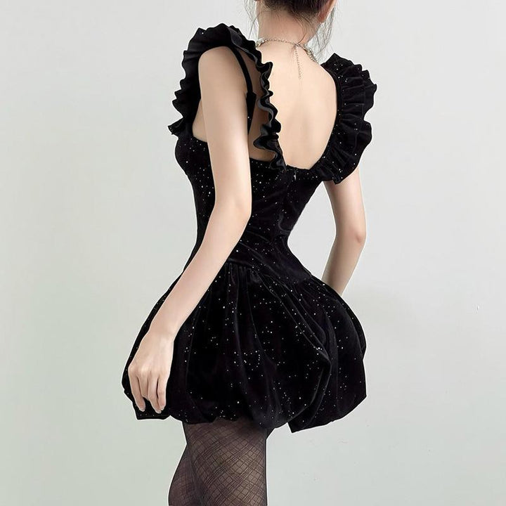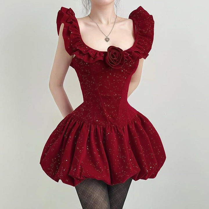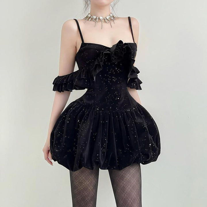 Glitter velvet ruffle flower applique 2-way cami mini dress