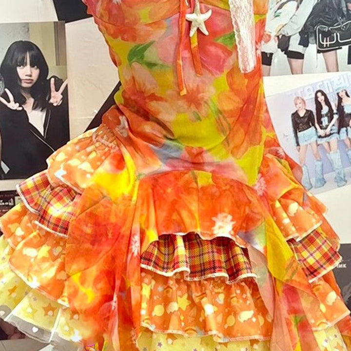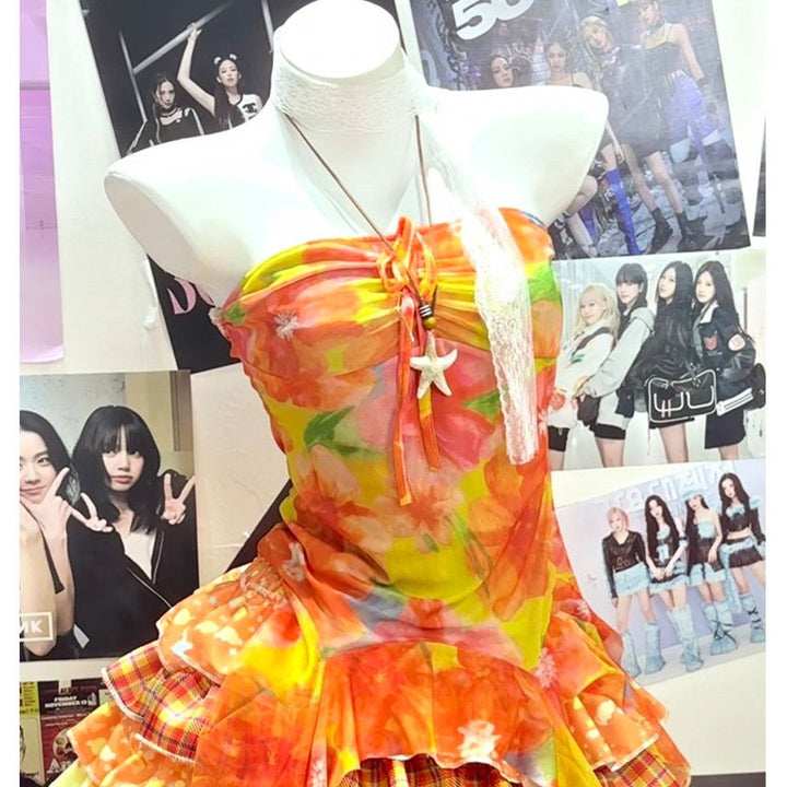 Halter contrast ruffle plaid patchwork mini skirt set
