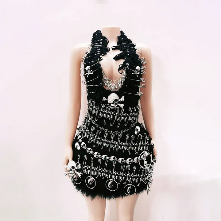Halter fluffy skull applique backless mini dress