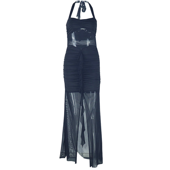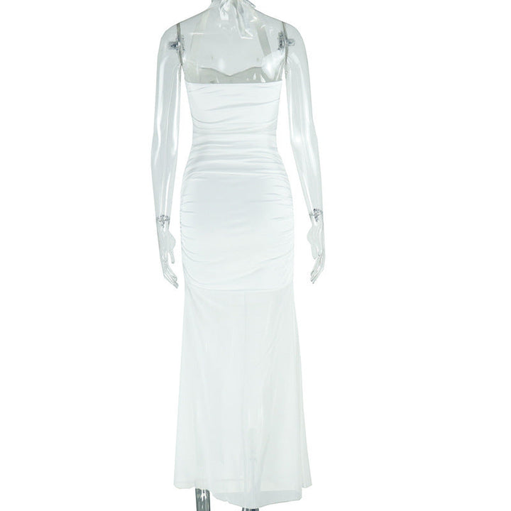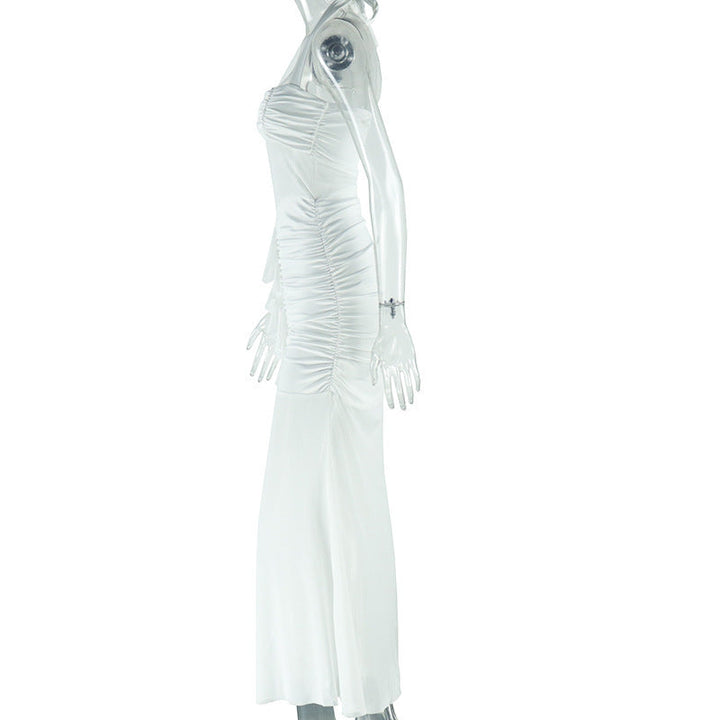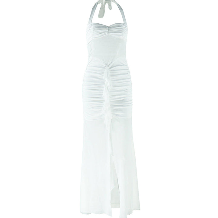 Halter self tie ruched v neck backless maxi dress