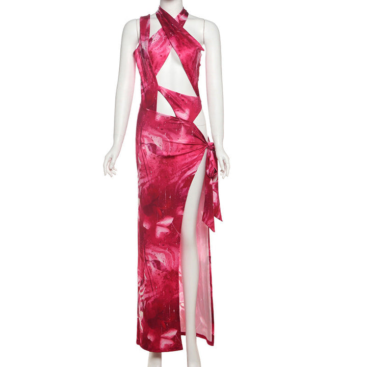 Hollow out irregular slit print halter maxi dress