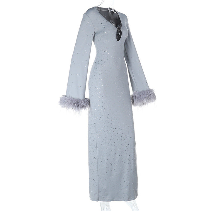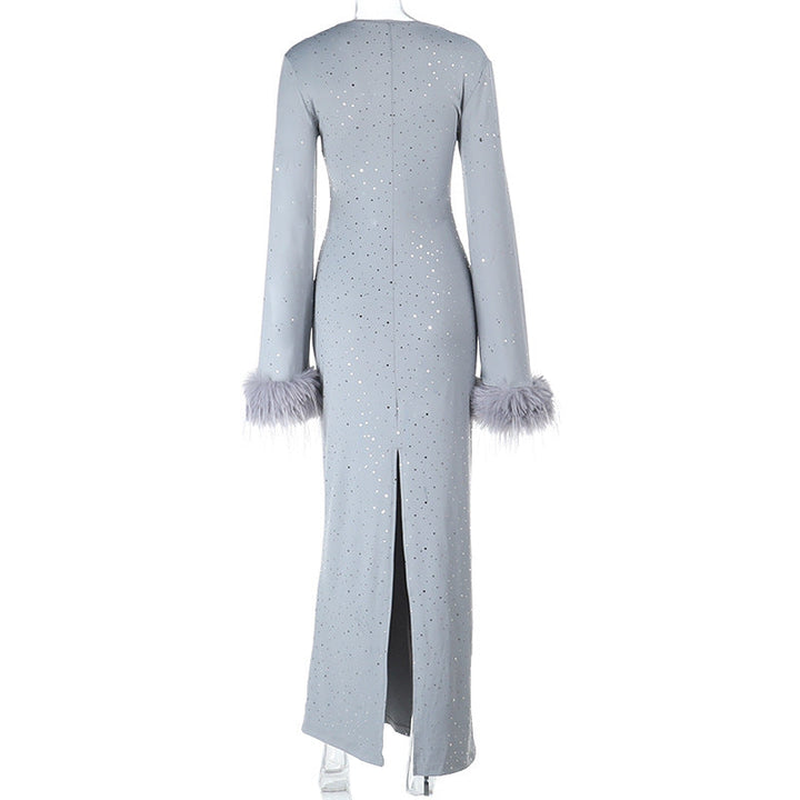 Hollow out slit long sleeve fluffy glitter maxi dress