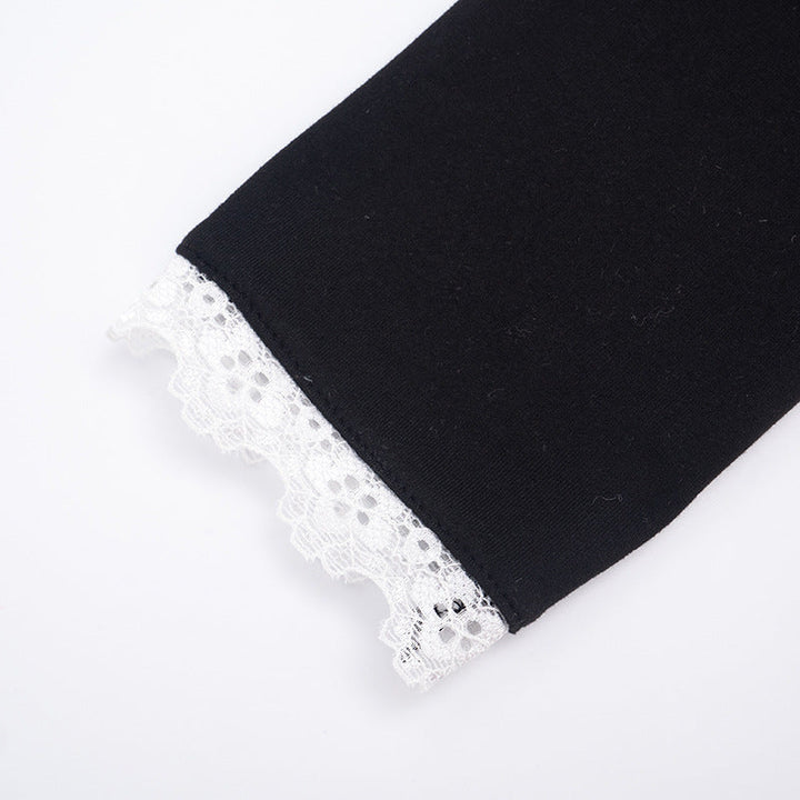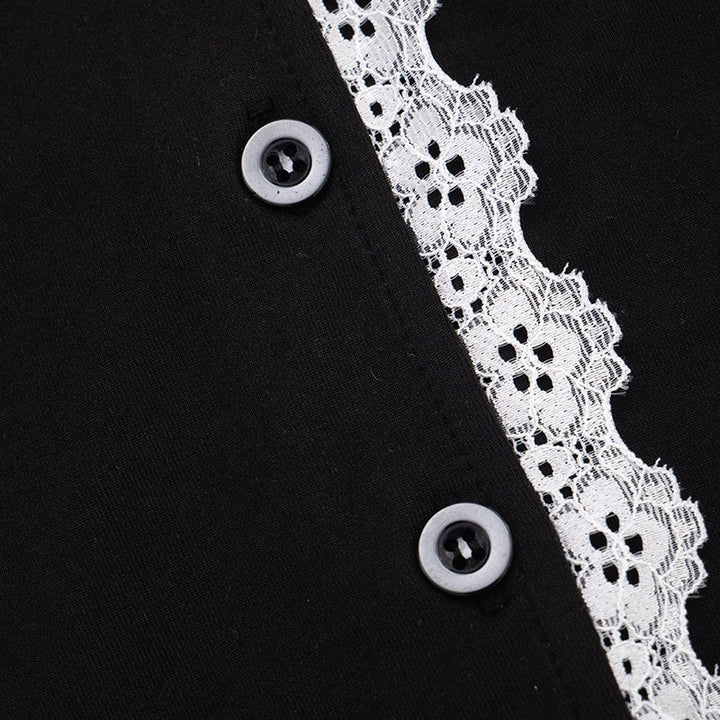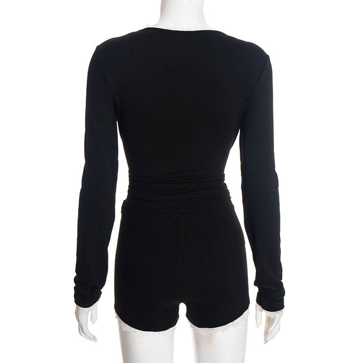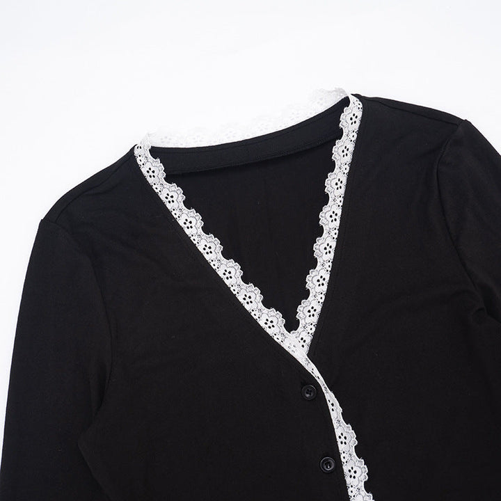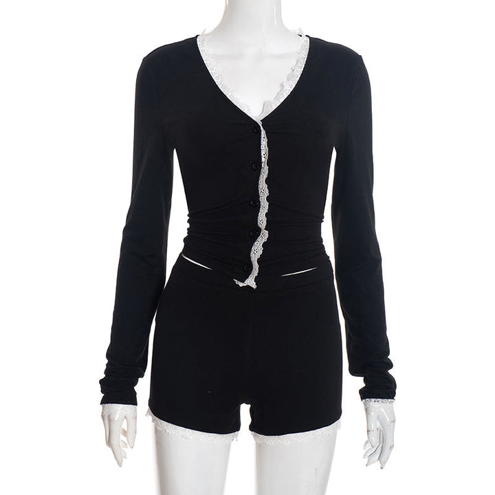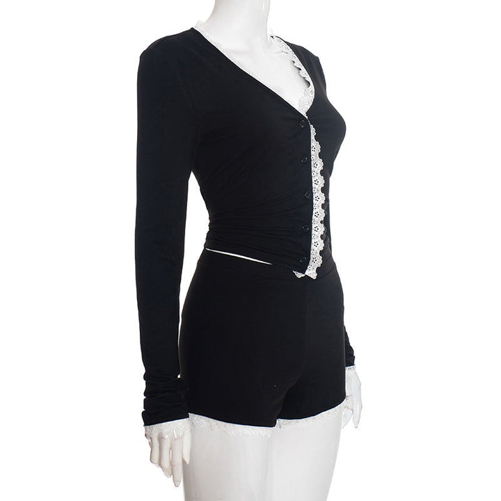Lace hem long sleeve v neck button low rise pant set