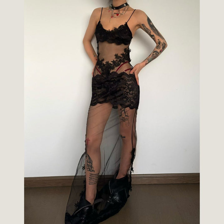 Lace hem v neck see through mesh cami maxi dress