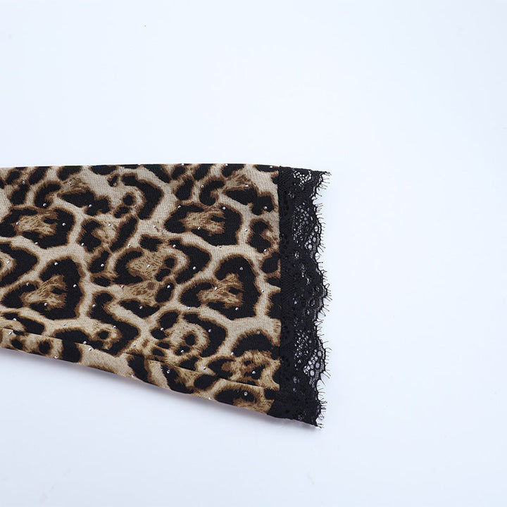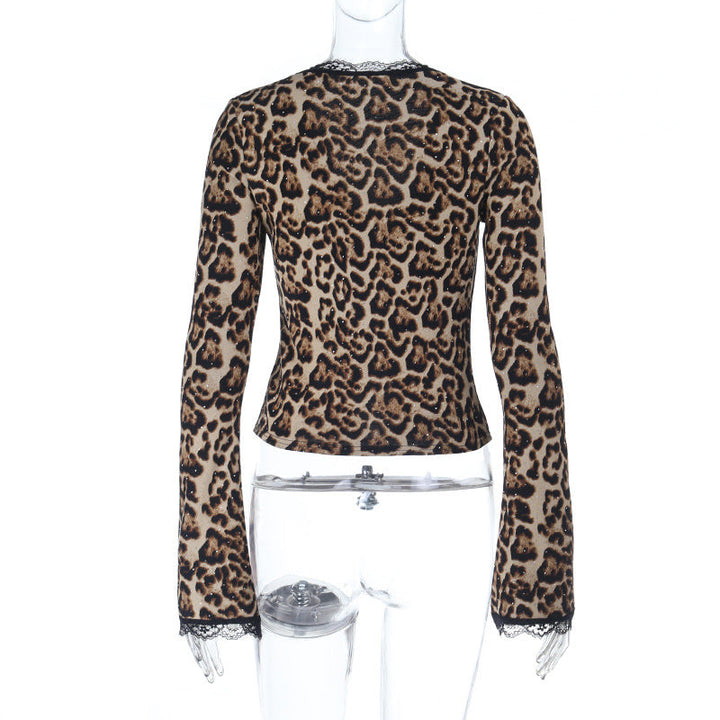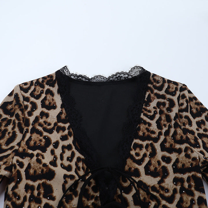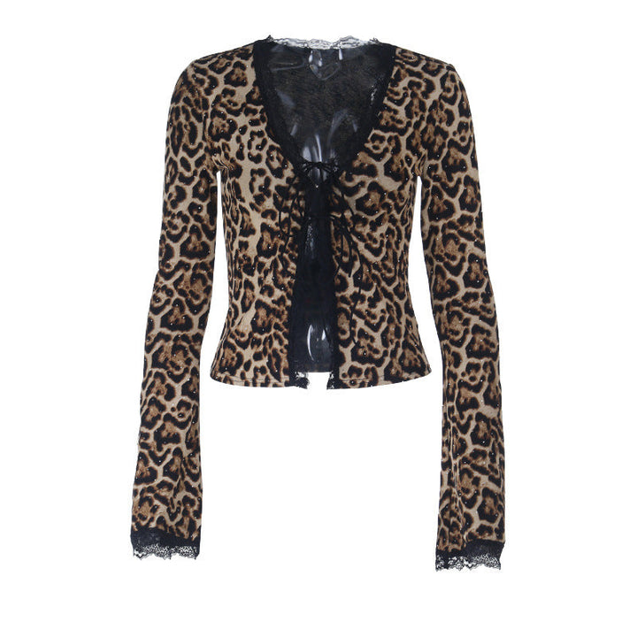 Leopard print lace hem v neck long sleeve self tie top