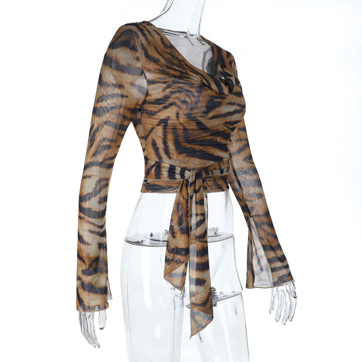 Leopard print long sleeve cowl neck self tie top