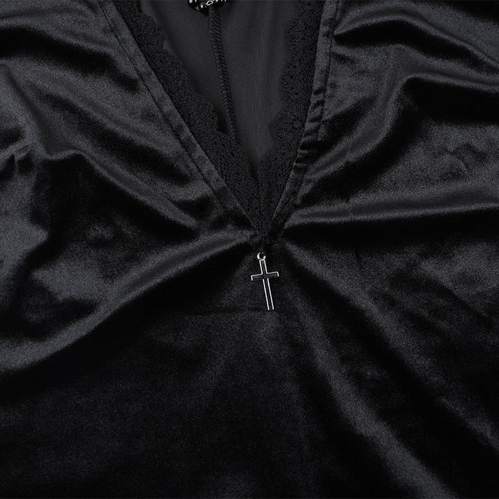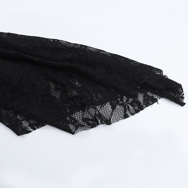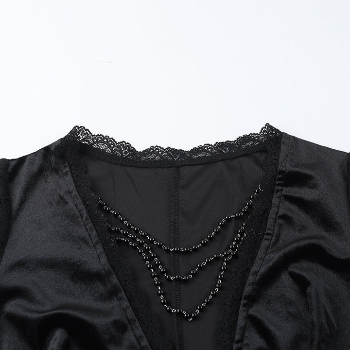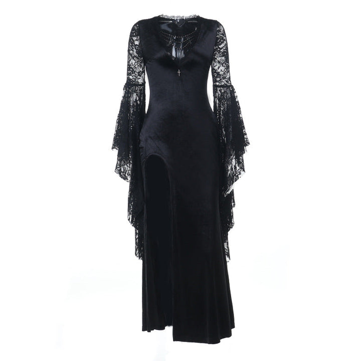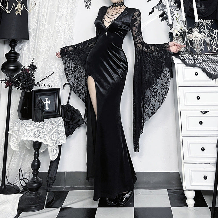 Long flared sleeve v neck beaded lace slit midi dress