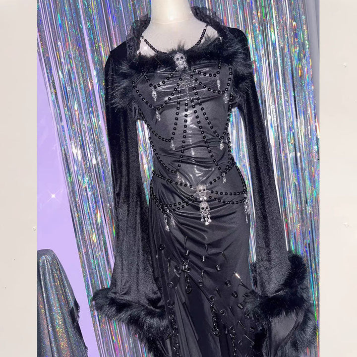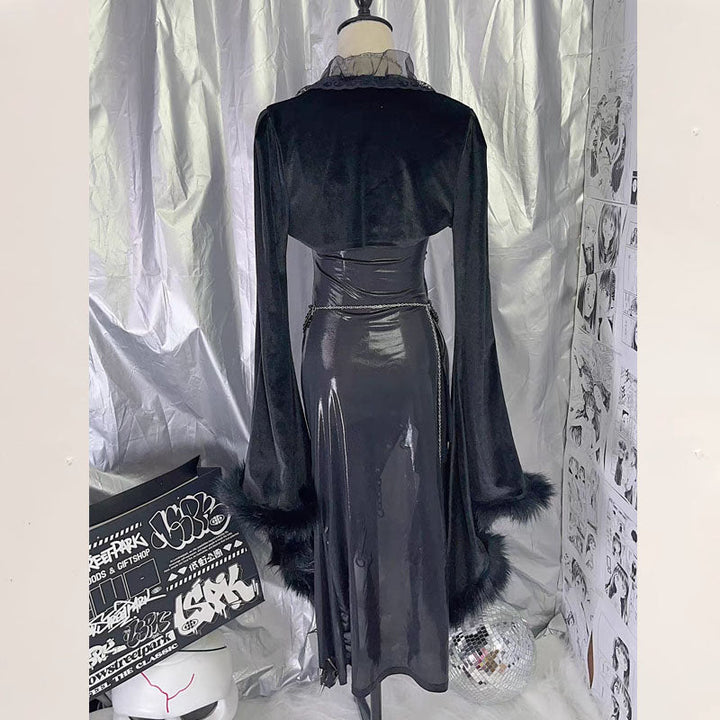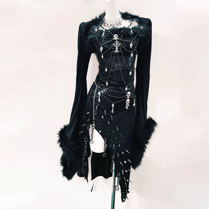 3 pieces set:Long sleeve fluffy irregular rivet applique mini dress