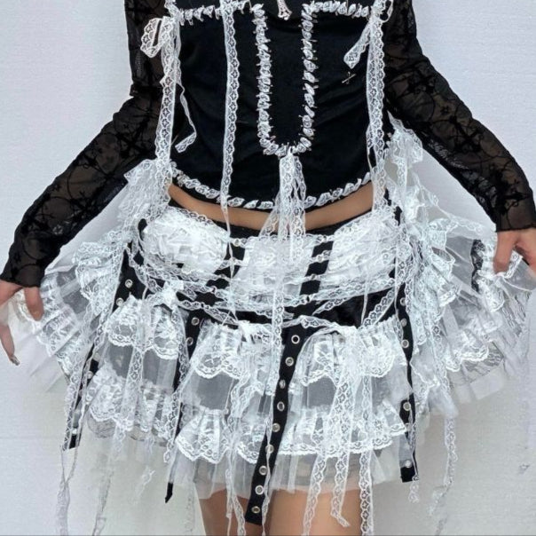 Long sleeve lace hem mesh cross pattern mini skirt set