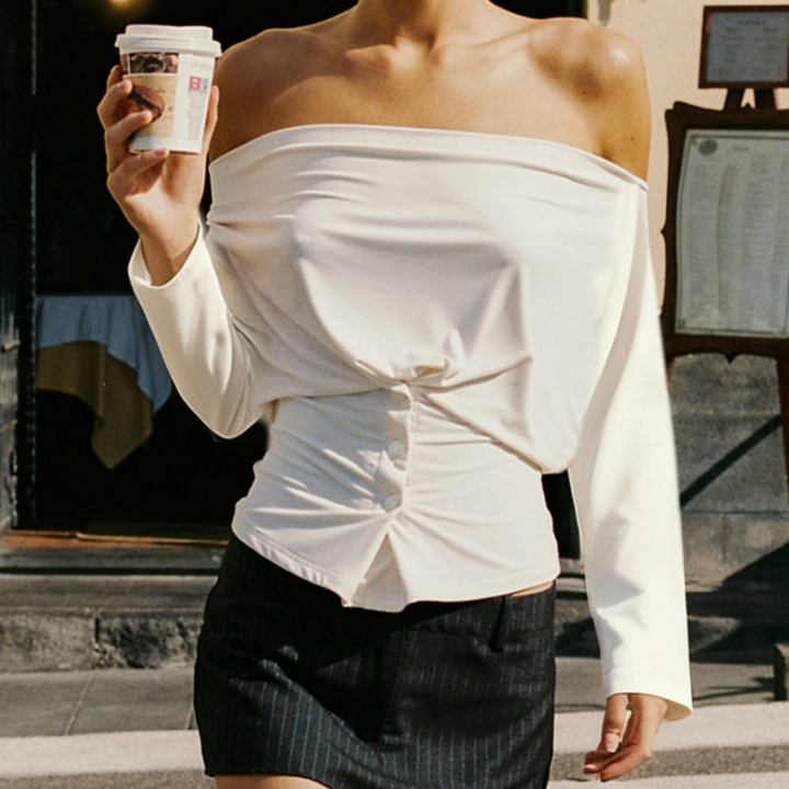Off shoulder long sleeve ruched button top