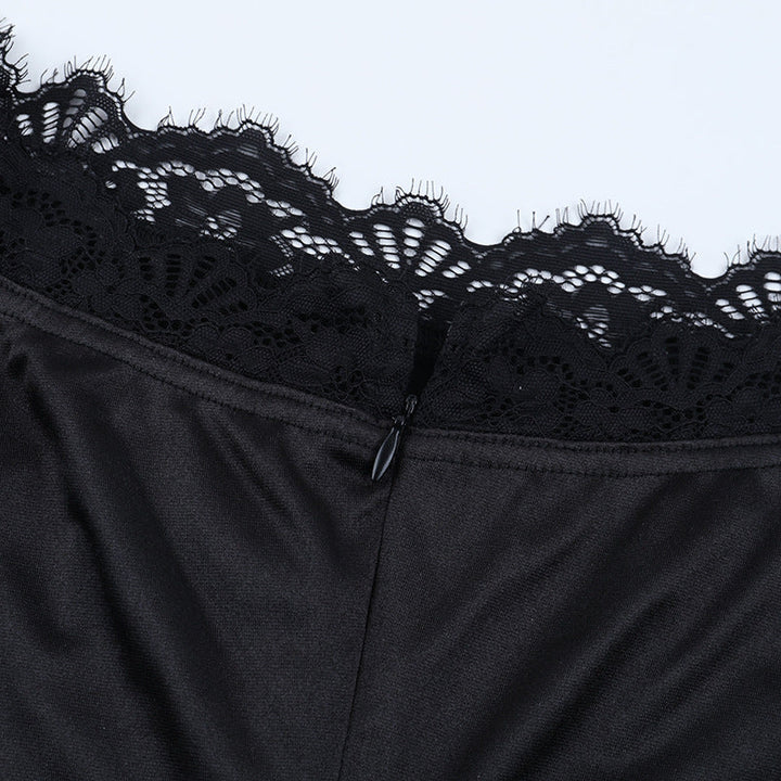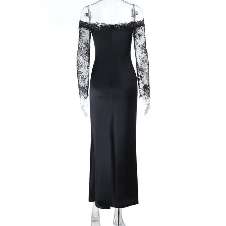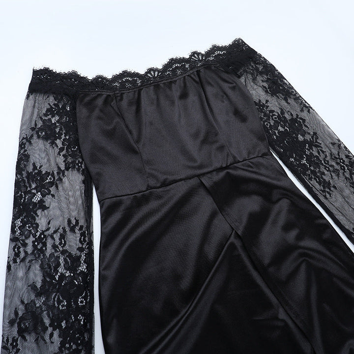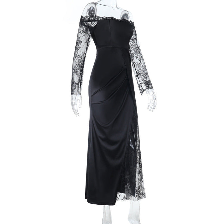 Off shoulder long sleeve slit zip-up lace hem maxi dress