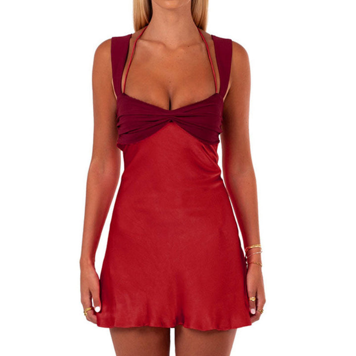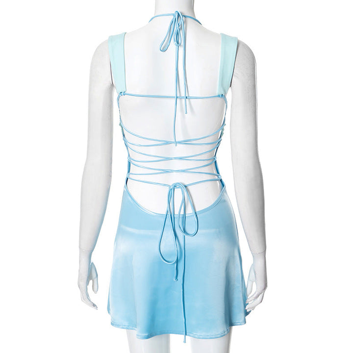 Ruched halter self tie v neck backless mini dress